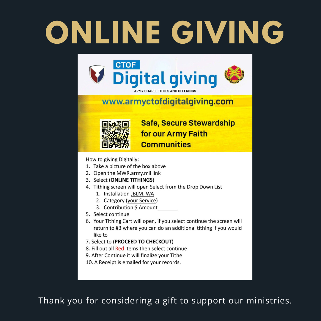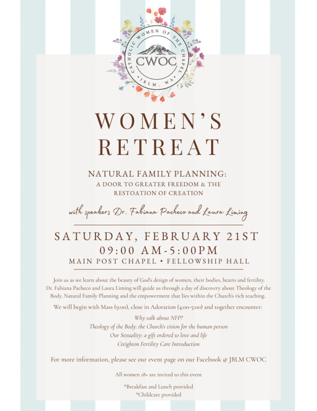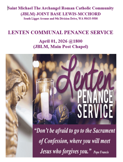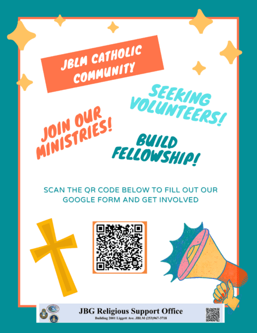 Our Catholic community is part of the Religious Support program of the Joint Base Lewis-McChord Religious Support Office. We are under the jurisdiction of the Archdiocese for the Military Services, USA. Our primary mission is the pastoral care of active duty Catholics serving in the Armed Forces and their families, through liturgical celebrations, religious education, and auxiliary programs across the JBLM chapels.