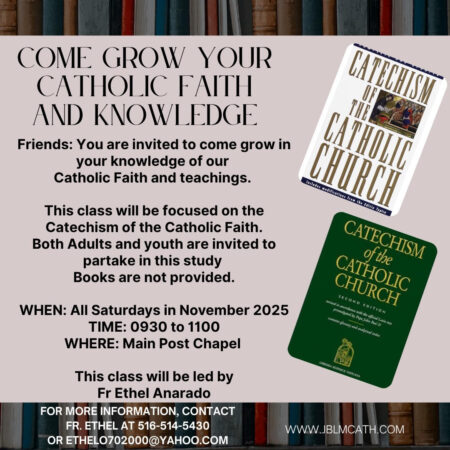 Fr. Ethel will be teaching from the Catechism of the Catholic Church. Both adults and youth are invited to partake in this study.