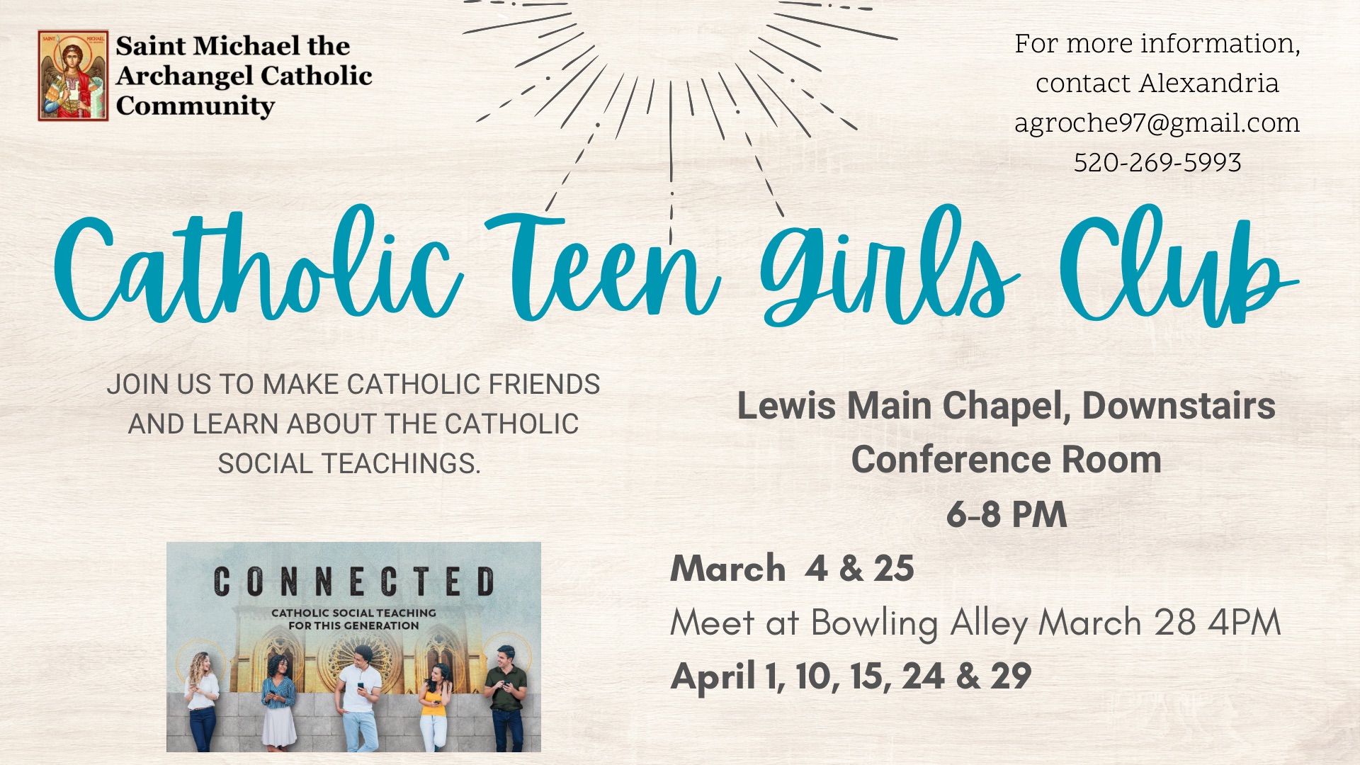 Catholic Teen Girls Club Join us to make Catholic friends and learn about the Catholic Social Teachings - Ascension Press Study: "Connected" Catholic Social Teaching for this Generation. For more information, contact Alexandria at agroche97@gmail.com