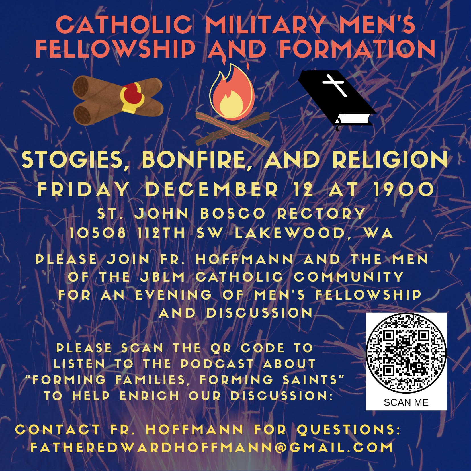 Lewis Main Chapel, Fellowship Hall/Activity Room Bldg 2001, South Liggett and Ninth Division Drive, Fort Lewis, WA, United StatesJoin us for our morning meeting as we continue discussing Sincerely Stoneheart by Emily Wilson Hussem. Please join us even if you haven't read! Childcare maybe available but kids are welcome to come and play! Meeting is potluck style so feel free to bring a dish to share, but no worries if you don't bring anything. Meetings are located in the Fellowship Hall. Additionally, daily Mass is offered at 12 in the Main Post Chapel and the opportunity for confession is also available following the meeting. Reading Discussion Schedule:11/13 Adoration/Ask Father11/20 Letters 34-3812/4 Letters 39-Farewell12/11 Christmas Party